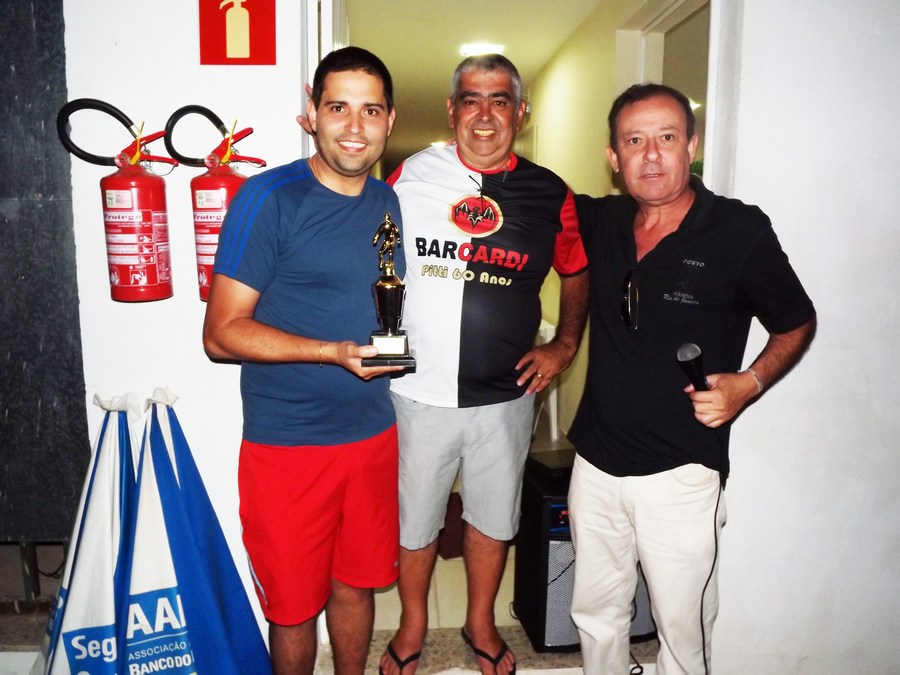 Wesley Reis (à esq.) recebe de Pitti Beuttemmüller e Márcio Bavária o “Troféu José Alfredo de Oliveira” por ter feito o gol mais bonito no ano nas peladas de futebol society no clube
