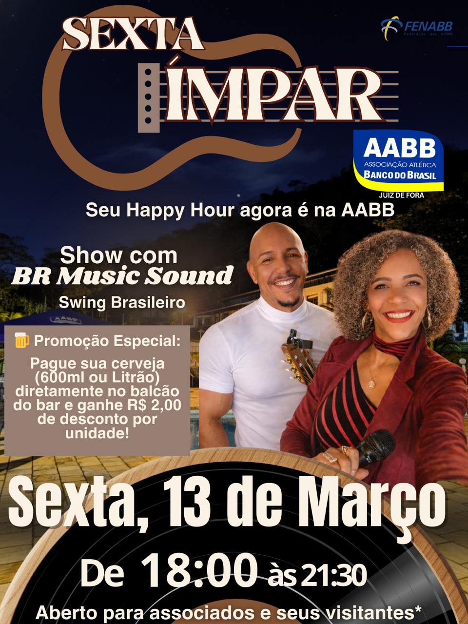 Venha curtir o melhor do swing brasileiro nesta sexta-feira, 13 de março, das 18:00 às 21:30, ao som de BR MUSIC SOUND, em sua primeira apresentação na AABB!